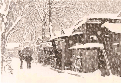 休息日,大雪天,況晗背著畫(huà)具出門(mén)作畫(huà)。濕式水彩畫(huà),講究水色淋漓,是用排筆將清水洇濕畫(huà)紙然后作畫(huà)。一幅寫(xiě)生未成,畫(huà)筆已然結(jié)冰。況晗的家鄉(xiāng)氣候濕潤(rùn),墻縫里面生的是青苔。北京的氣候干燥,墻縫里面積存的是數(shù)百年的塵土。家鄉(xiāng)村野的色調(diào)是青綠,京城胡同的色調(diào)是灰白,于是況晗改用寬線(xiàn)條鉛筆畫(huà)來(lái)寫(xiě)意胡同。