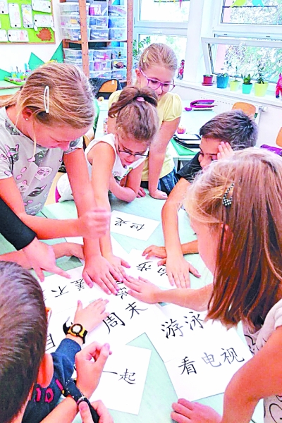 在匈牙利首都布達佩斯,匈中雙語學校的學生在課堂上復(fù)習漢語生詞。新華社發(fā)