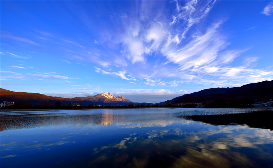 我是被亮光驚醒的。我和很多水從象山腳下的黑龍?zhí)睹俺鰜?。咕咚一聲翻上水面??匆姾芏嗖煌拥娜?。黑頭發(fā)的人,黃頭發(fā)的人。黑眼睛的人,藍(lán)眼睛的人。我看見了潭邊的亭臺(tái)樓閣??匆娏嘶ㄅc樹。我還順著人們遠(yuǎn)眺的目光看見了玉龍雪山,晶瑩奪目矗立在藍(lán)天下面。潭水映照雪山,真讓人目眩神迷啊。人們在橋上,在堤上,說著不同的語言。在不同的語言里,都有那個(gè)詞頻頻出現(xiàn):麗江,麗江。這時(shí)的麗江已經(jīng)是一座很大的城了。城里也不是只有最初筑城的納西人了。如今全中國全世界的人都要來麗江,看納西古城的四方街,看玉龍雪山。