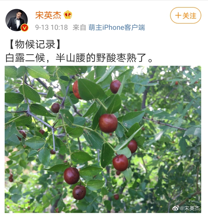 如今,他仍然會(huì)隨手在社交媒體上記錄四時(shí)風(fēng)物的變化,前幾天發(fā)了一張照片,配文“白露二候,半山腰的野酸棗熟了。”對(duì)他而言,隨時(shí)關(guān)注氣候與物候,已經(jīng)成為一種習(xí)慣。(完)