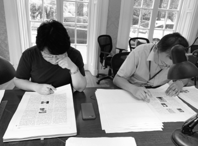 上海辭書出版社社長(zhǎng)秦志華(右)和副總編輯張敏審讀《辭?!罚ǖ谄甙妫┬印?/font>