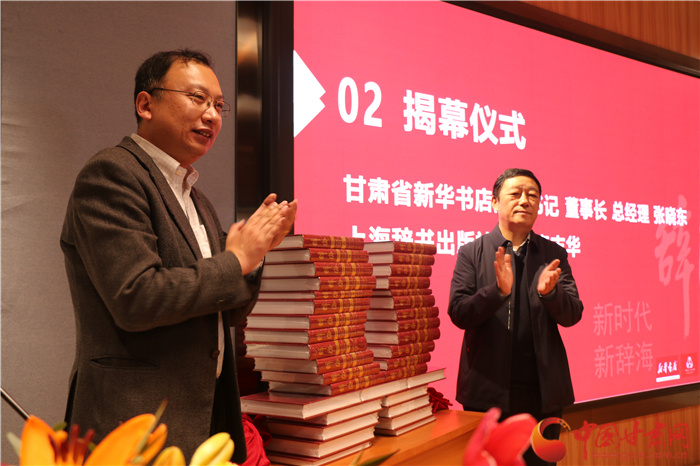 甘肅省新華書店黨委書記、董事長、總經理張曉東(右)與上海辭書出版社社長秦志華(左)共同為首發(fā)式揭幕。