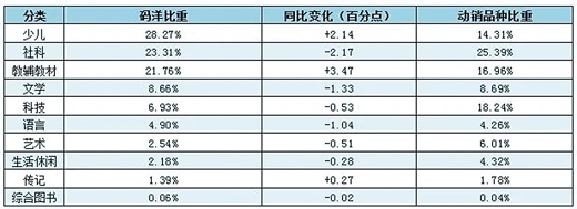 從細(xì)分市場情況來看,中小學(xué)幼兒園教材、法律、傳記、學(xué)術(shù)文化、教輔和少兒類呈現(xiàn)正向增長,其余類別均表現(xiàn)為同比負(fù)增長。