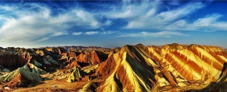 丹崖錯落千重畫,霞光絢爛萬古錦??v觀丹霞全景,層理交錯,氣勢磅礴,造型奇特,色彩斑斕,紋理分明,色帶隨著山勢起伏呈現(xiàn)波浪狀,尤如艷麗的彩帶隨風(fēng)蜿蜒飄動。行游其中,仿佛進(jìn)入了瑤池仙境,令人心曠神怡。