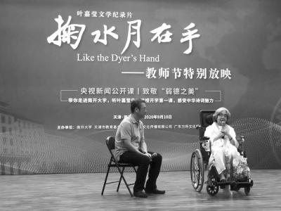 九月十日教師節(jié),南開大學(xué)舉辦《掬水月在手》影片首映式。葉嘉瑩先生是國際儒聯(lián)榮譽(yù)顧問,我銜命陪同王念寧副會長專程赴南開致賀,有幸在南開禮堂聆聽九十六歲高齡的迦陵先生與白巖松共話詩意人生。迦陵先生坐在輪椅上娓娓道來,鬢發(fā)皤然,聲如洪鐘,風(fēng)華絕代。
