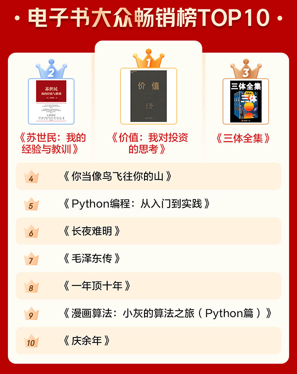 通過電子書暢銷榜TOP10和有聲暢銷榜TOP10可以看出,很多人愈發(fā)關(guān)注投資和管理等方面的內(nèi)容,也愈發(fā)注重個人學(xué)習(xí)。《價值:我對投資的思考》《蘇世民:我的經(jīng)驗與教訓(xùn)》 分別位居電子書暢銷榜第一名和第二名?!吨袊?jīng)濟2020》《原則》進入有聲暢銷榜前十。此外,學(xué)習(xí)類圖書《Python編程:從入門到實踐》《漫畫算法:小灰的算法之旅(Python篇)》也上榜電子書暢銷榜前十。
