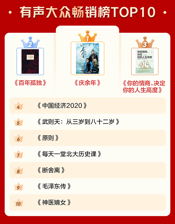 隨著大IP改編影視劇的熱度逐年升高,影視劇原著小說也越來越成為數(shù)字閱讀中最暢銷的書籍類型。其中,《慶余年》隨著電視劇的火爆和《慶余年2》原班人馬即將開拍帶來的熱議流量,其原著小說入圍電子書暢銷榜TOP10和有聲書暢銷榜TOP10;改編為《沉默的真相》的紫金陳原著小說《長夜難明》則位列電子書暢銷榜第6名。