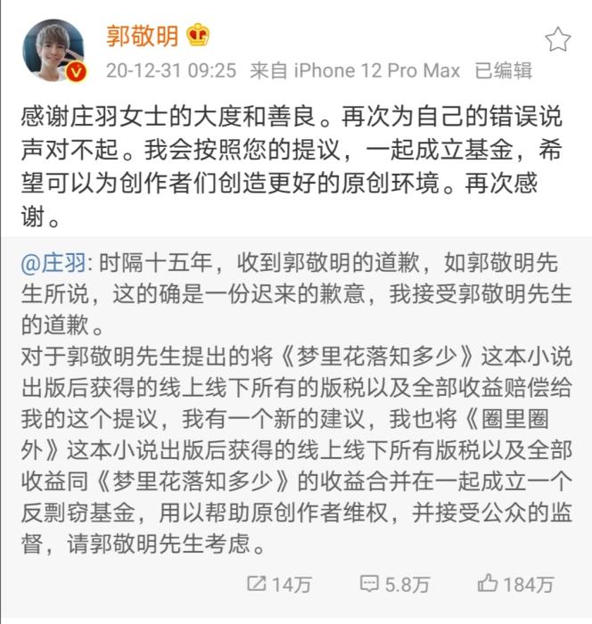 2020年12月31日,郭敬明通過(guò)微博就其小說(shuō)《夢(mèng)里花落知多少》抄襲莊羽小說(shuō)《圈里圈外》一事道歉:“時(shí)間過(guò)去了十五年,這個(gè)錯(cuò)誤一直伴隨著我,從我年少,到青年,到如今馬上走向四十歲的人生中點(diǎn)。”