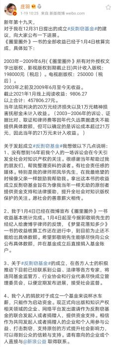 2021年1月19日,莊羽公布了“反剽竊基金”的最新進(jìn)展:《圈里圈外》一書(shū)的全部收益已經(jīng)于1月4日核算完成。