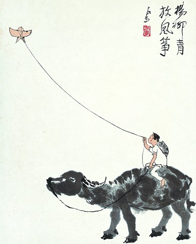 此后,隨著學(xué)識的增加,關(guān)于牛的意象不斷拓展。“天蒼蒼,野茫茫。風(fēng)吹草低見牛羊”,這是南北朝時期的《敕勒歌》,廣袤的草原為牛提供了開闊的活動空間與豐贍的食物,多么安詳自在的景象呀!“隔岸橫州十里青,黃牛無數(shù)放春晴。船行非與牛相背,何事黃牛卻倒行。”這是楊萬里的詩作《過大皋渡》,黃牛不會倒行,而是船行河中水流太急,生活的趣味里悄然透著淡淡的哲理。“門外一溪清見底,老翁牽牛飲溪水。溪清喜不污牛腹,豈畏踐霜寒墮趾。”這是陸游詩作《飲牛歌》,用老翁飲牛的潔凈溪水,比襯自我的廉潔之志。往后看更見意趣,“牛能生犢我有孫,世世相從老故園”,借助牛繁衍生犢,渲染門庭興旺,而且世代情系故園,真是不忘初心呀!“草滿池塘水滿陂,山銜落日浸寒漪。牧童歸去橫牛背,短笛無腔信口吹。”這是宋代雷震的詩作《村晚》,鄉(xiāng)村的黃昏恬靜怡和,靜在草叢,靜在池塘,靜在倒映于水面的“山銜落日”,這未免有點(diǎn)沉寂吧?打破沉寂的是牛,是趨步前行的牛,還有牛背上飛出的短笛聲,這聲音毫無約束,信口吹響,自由飛揚(yáng)。