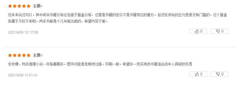 有“歐氣”讀者抽到隱藏款:“等了好久終于收到了,我收到的書都有塑封,不錯不錯,書的豆瓣評分都在七八分左右。”“抽到了隱藏款,開心,是一套推理小說。”;也有人感到書籍不盡人意:“選書有點(diǎn)失望都是舊書的感覺,一本《餌室》,一本《紅色棺材之謎》,有點(diǎn)臟,也能接受,送的文創(chuàng)本子很好看,書袋也不錯,買兩個盲盒都是一樣的文字,不同的顏色,這個有點(diǎn)可惜了。”“發(fā)貨慢,兩本推理小說一本臨摹畫本。圖書可能是我期待過高,印刷一般。”