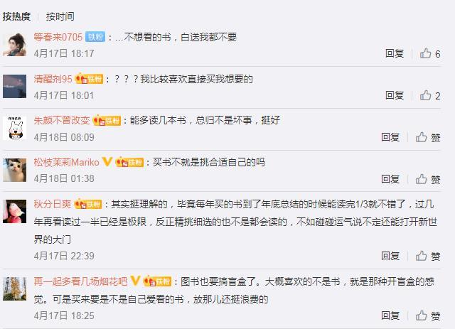 此前,部分網(wǎng)友在中新經(jīng)緯微博評論對“圖書盲盒”現(xiàn)象開展討論。有網(wǎng)友提到,“其實(shí)挺理解的,畢竟每年買的書到了年底總結(jié)的時候能讀完1/3就不錯了,過幾年再看讀過一半已經(jīng)是極限,反正精挑細(xì)選的也不是都會讀的,不如碰碰運(yùn)氣說不定還能打開新世界的大門。”也有網(wǎng)友認(rèn)為,“不想看的書,白送我都不要”“買書不就是挑合適自己的嗎”等等。