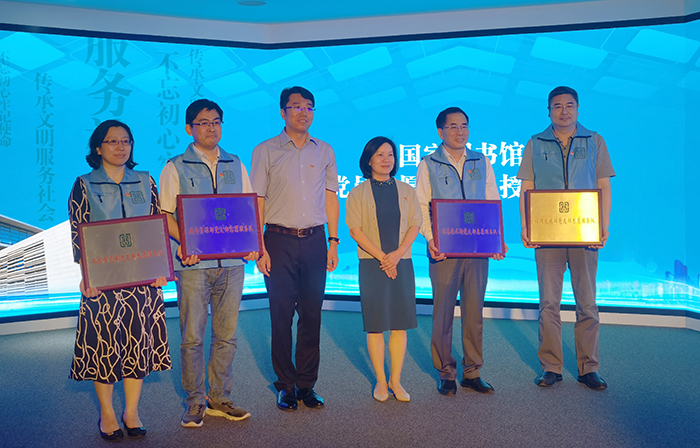 6月8日上午,國家圖書館新閱讀空間開放暨黨員志愿服務(wù)總隊(duì)成立活動在國家圖書館總館北區(qū)舉行?;顒蝇F(xiàn)場,國家圖書館黨委書記、副館長魏大威,國家圖書館副館長、黨委副書記陳櫻為4支黨員志愿服務(wù)分隊(duì)代表授牌。