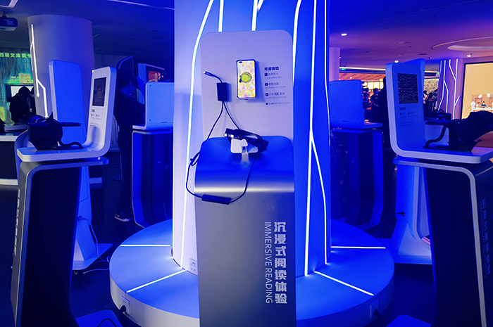 “全景展廳”首次采用270度環(huán)繞的LED三折屏幕,實(shí)現(xiàn)巨幕裸眼VR效果,讀者置身于三面超高清大屏環(huán)繞的全景空間,可獲得較強(qiáng)的沉浸感和真實(shí)的畫面感。“閱讀樹”將移動智能設(shè)備、VR設(shè)備與樹形展架有機(jī)結(jié)合,讀者可通過現(xiàn)場不同的VR設(shè)備終端,觀看古代典籍、國畫、文物古跡、城市印象等不同類型的VR視頻資源。