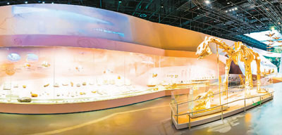 武漢自然博物館展示的中加馬門溪龍化石、硅化木和“龍”足跡化石墻。 本文圖片均由長(zhǎng)江文明館(武漢自然博物館)提供