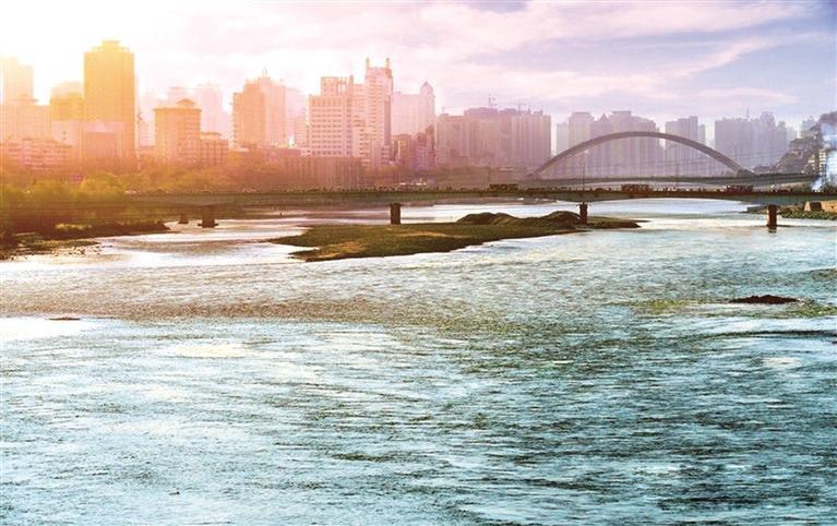 河分南北,勢接東西。舒寧陜之博帶廣袖,帶青藏之峨冠雪衣。山逶迤而續(xù)祁連,水澎湃而瀉右?guī)?。匯洮湟之迤邐,有容乃大;與華夏之康莊,唇齒相依??睾游髯呃?,自古而始;俯渭涇秦川,由朝至夕。綴葫蘆狀岸渚坪灘,幾多古渡;依膏腴處坡谷盆地,即就蕃息。筑虹蜺經百年,鐵橋第一;盤游龍於今朝,立交數十。去病鞭地,五泉山勝于秀逸;永誠建院,白塔寺高于云齊。指點九州,大禹登九州之臺;漂流黃河,洋人恐招手之磯。草覆馬銜而能牧,林茂興隆云可棲。繞營盤高嶺排五,峙雄關沿河有七。留千古名,白馬浪細聽湍流不息;鎖萬代鑰,金城關只留站牌不奇。雷壇留碑,金天觀曾殿宇壯麗;華林無寺,節(jié)能燈照幽路石基。湍流黃河,九曲回腸依然東去;水轉輪盤,十方高地亦滿紛披。