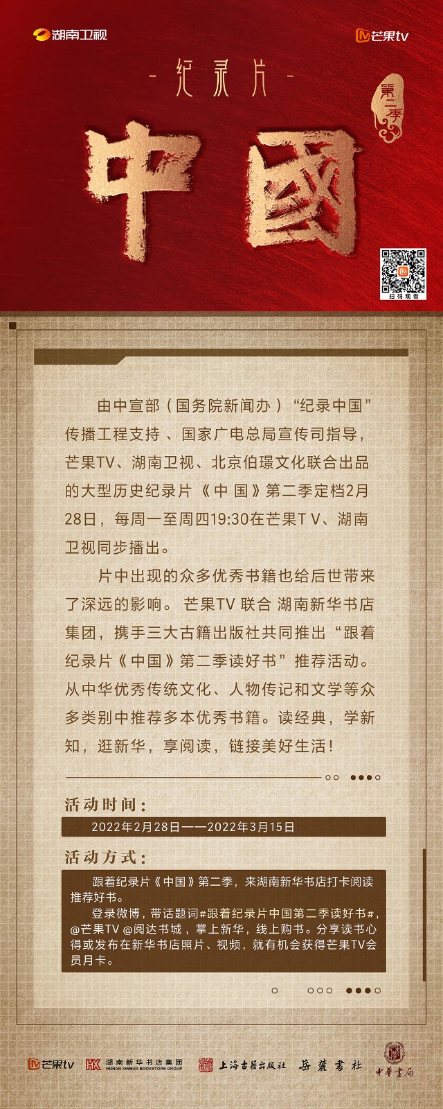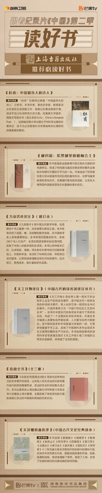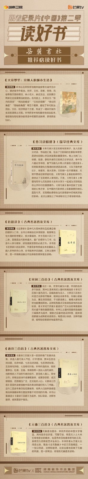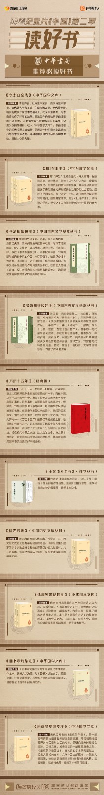 芒果TV以紀(jì)錄片《中國(guó)》第二季的精美品質(zhì),聯(lián)合湖南新華書(shū)店集團(tuán)的美譽(yù)口碑,將中華書(shū)局、上海古籍出版社、岳麓書(shū)社推薦的珍品好書(shū),傾情向大眾推薦。本次“跟著紀(jì)錄片《中國(guó)》第二季讀好書(shū)”活動(dòng),將從2月28日持續(xù)到3月15日,湖南新華書(shū)店集團(tuán)旗下湖南圖書(shū)城、不吝Boolink書(shū)店、全省市級(jí)中心門(mén)店、長(zhǎng)沙地區(qū)樂(lè)之書(shū)店等全員參與,推薦紀(jì)錄片《中國(guó)》第二季。書(shū)友及觀(guān)眾可登錄微博或到線(xiàn)下門(mén)店打卡參與活動(dòng)。