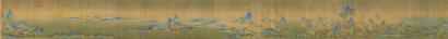 公元1100年19歲趙佶登基,年輕的宋徽宗開啟了屬于他的藝術(shù)新紀元。在徽宗傾力關(guān)心的翰林圖畫院中聚集了一大批優(yōu)秀的畫家,如李唐、朱銳、張擇端,其中李唐的《江山小景》,張擇端的《清明上河圖》都以手卷的形式描繪了從自然到都市的繁華,這樣的極致華麗是宋代院體山水畫卷的主旋律。最能體現(xiàn)華麗之美的山水卷莫過于出自當(dāng)時還未入畫院,但已被徽宗視為“其性可教”并“親授其法”的18歲少年王希孟所繪的《千里江山圖》。此卷縱51.5厘米,橫1191.5厘米,可謂真正的長卷,所繪千山萬壑,峰巒起伏連綿,江河煙波浩渺壯麗,山林間有人物、飛泉、房舍、樓臺、林木、花竹、漁舟、游船,遠處島嶼相疊,汀渚綿延,水天相接,好一個理想中華麗光明的太平世界。山水是宇宙之大物,人在山林丘壑間游歷是見不到山水之全貌的。山水畫要將千里之景容納咫尺絹素,唯手卷的形制才得以在有限之內(nèi)展示無限的浩瀚。