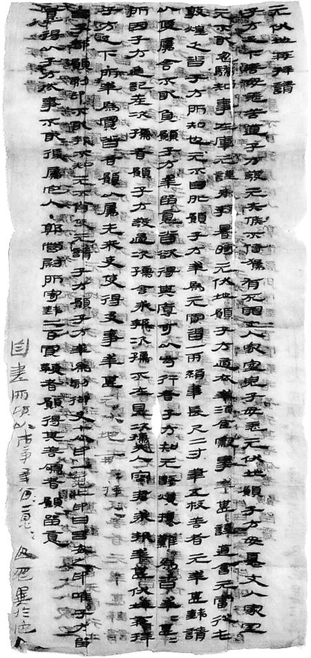 子方足下,善毋恙!苦道子方發(fā),元失候不侍駕,有死罪。丈人、家室、兒子毋恙,元伏地愿子方毋憂。丈人、家室元不敢忽驕,知事在庫,元謹(jǐn)奉教。暑時元伏地愿子方適衣、幸酒食、察事,幸甚!謹(jǐn)?shù)溃簳?dāng)從屯敦煌,乏沓,子方所知也。元不自外,愿子方幸為元買沓一兩,絹韋,長尺二寸;筆五枚,善者,元幸甚。錢請以便屬舍,不敢負(fù)。愿子方幸留意,沓欲得其厚、可以步行者。子方知元數(shù)煩擾,難為沓。幸甚幸甚!所因子方進(jìn)記差次孺者,愿子方發(fā)過次孺舍,求報。次孺不在,見次孺夫人容君求報,幸甚,伏地再拜子方足下!所幸為買沓者,愿以屬先來吏,使得及事,幸甚。元伏地再拜再拜!