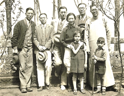 讀書生活之余,在昆明西山的合影。左起:周培源、梁思成、陳岱孫、林徽因、金岳霖、吳有訓,孩子為梁再冰、梁從誡