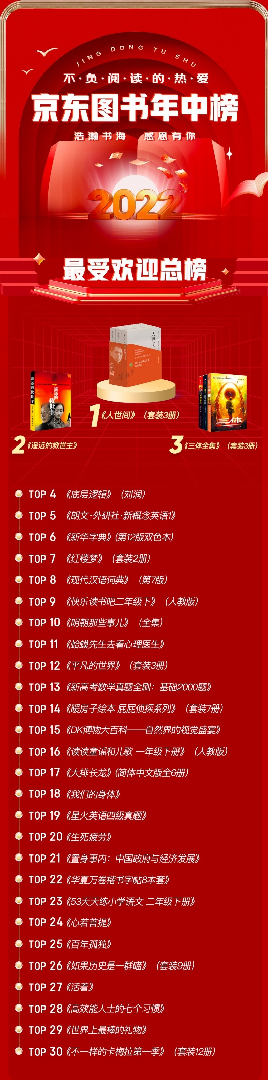 近日,京東圖書發(fā)布了2022年中圖書暢銷榜,包括總榜、新書榜,以及文學(xué)、經(jīng)管、童書、社科、科技、勵(lì)志、生活、藝術(shù)、文教、考試等10個(gè)類別的分榜,每個(gè)榜單均有30種圖書入榜,入榜圖書總數(shù)超過(guò)300種。