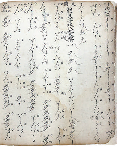 二是音位型曲譜,以各類符號指代樂器上的音位。使用這類曲譜,必須首先明確弦樂器的定弦、定品方式,管樂器的開孔標(biāo)準(zhǔn)和按孔、吹奏方法,才能確定每個音位的實際音高。正因如此,音位譜往往與樂曲宮調(diào)密切相關(guān)。同一份譜子,換用不同宮調(diào)演奏,音響大不相同。20世紀(jì)初,敦煌藏經(jīng)洞曾發(fā)現(xiàn)一份五代時期的曲譜,采用20個琵琶音位符號記錄,是目前已知這類曲譜的早期代表。