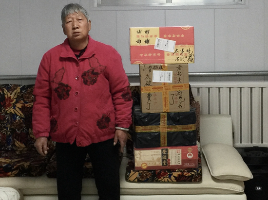 孫洪正老伴站在賈永婷寄來的快遞旁合影。受訪者供圖