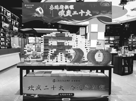 廣西新華書店集團(tuán)股份有限公司組織全區(qū)各連鎖門店先后開展了“喜迎二十大 助力新發(fā)展”主題圖書展示展銷、“歡慶二十大 奮進(jìn)新征程”主題系列活動(dòng)。廣西新華書店集團(tuán)股份有限公司相關(guān)負(fù)責(zé)人介紹,全區(qū)門店近期開展“歡慶二十大 奮進(jìn)新征程”主題門店美陳大賽,通過精選出111個(gè)全國(guó)近期出版的主題圖書品種進(jìn)行重點(diǎn)展示,配套主題海報(bào)、背景板,以各門店融合當(dāng)?shù)靥厣拇a堆造型進(jìn)行整體美陳,向廣大讀者推薦一批導(dǎo)向正確、質(zhì)量上乘的優(yōu)秀主題圖書。