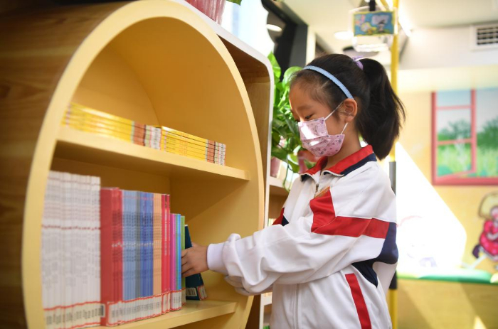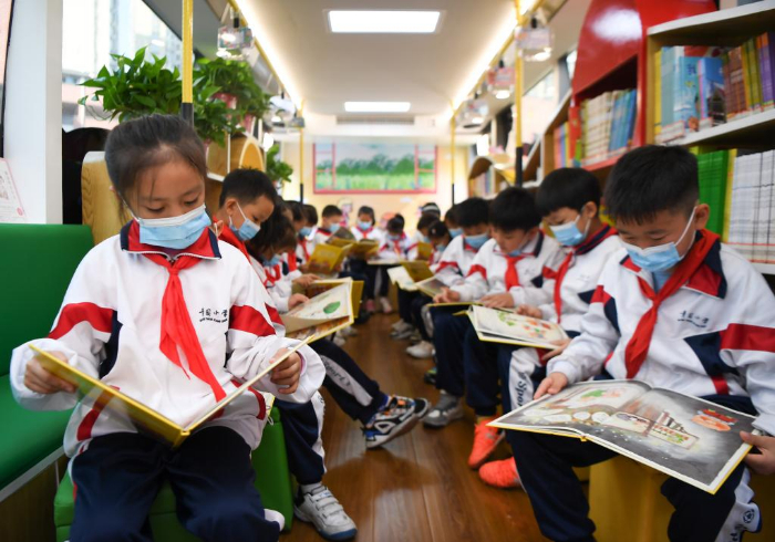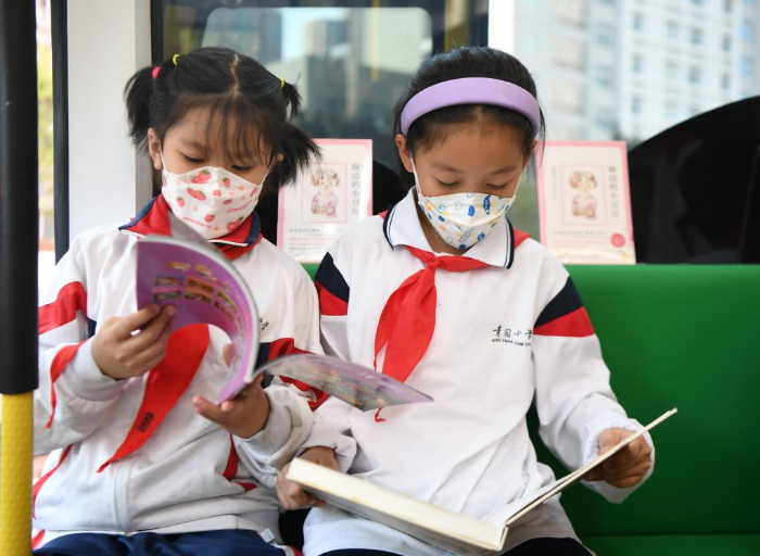 11月10日,學生在長沙市青園友誼小學巴士圖書館內(nèi)閱讀。