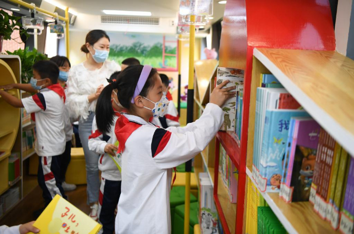 11月10日,學生在長沙市青園友誼小學巴士圖書館內(nèi)歸還圖書。
