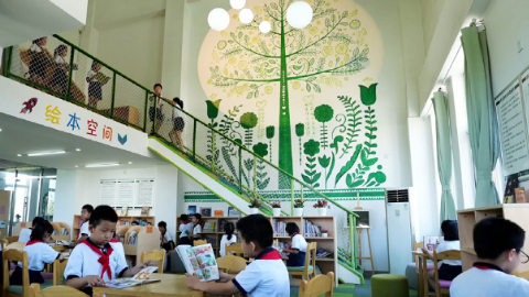 小學(xué)生在校內(nèi)繪本館自主閱讀繪本