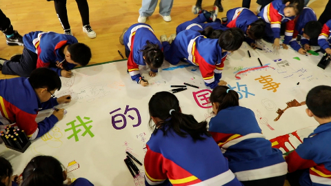 學(xué)生在繪本進校園活動中手繪畫布“我的中國故事”