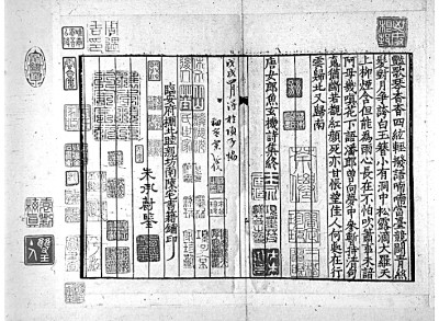 范景中先生曾見過謝蘭墀擺印本《唐宋文醇》,是書“正文用墨印,墨點(diǎn)用朱印,御評用黃印,朱子評用朱印,各家評用藍(lán)印,實(shí)為四色套印”。至于《唐宋詩醇》,范先生認(rèn)為是木活字五色套印。其主要依據(jù)是《詩醇》凡例云:“評語悉準(zhǔn)《唐宋文醇》之例,色別書之,但其中有援據(jù)正史雜說用資考訂疏解者,與古今人評詩之語義各有在,《文醇》未經(jīng)區(qū)別,今于藍(lán)筆之外,另作綠筆書,以便閱者,燦若列眉。”按照凡例的說法,《詩醇》在《文醇》朱、墨、黃、藍(lán)的基礎(chǔ)上又加了綠色,由此可知是五色套印本。實(shí)際上《唐宋詩醇》中并無康熙御評,因此未用黃色。湖南省圖書館藏有一部謝蘭墀擺印本《唐宋詩醇》,八冊,四十七卷全。我們委托張諾丕同學(xué)代檢全書,亦僅朱、墨、藍(lán)、綠四色而已,由此可知楊成凱先生所說四色套印本是正確的,而《增訂四庫簡明目錄標(biāo)注》著錄的五色套印本恐不可信。