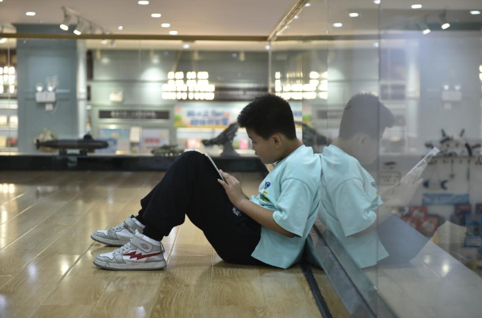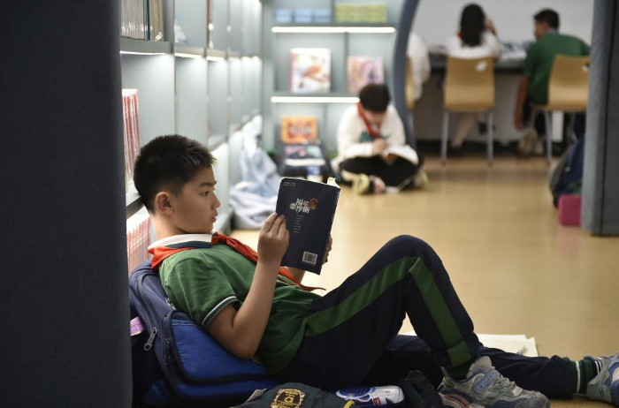 10月18日,一名小學生在鄭州市緯五路第一小學校園閱讀中心內(nèi)閱讀。
