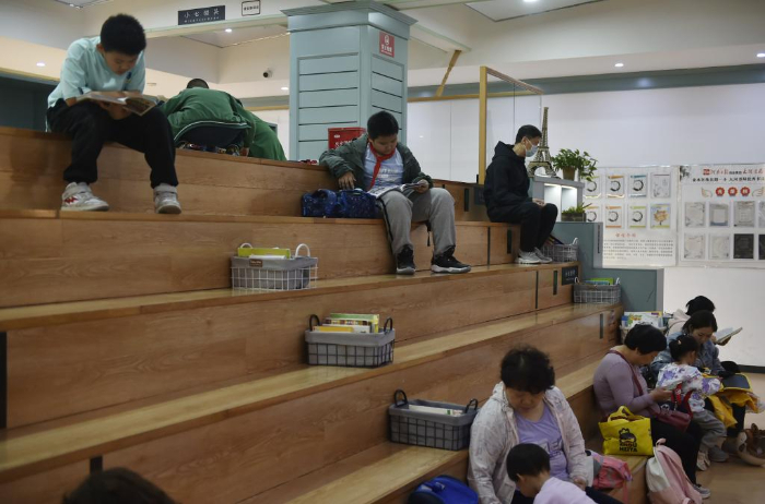 10月18日,家長帶著小朋友在鄭州市緯五路第一小學校園閱讀中心內(nèi)閱讀。