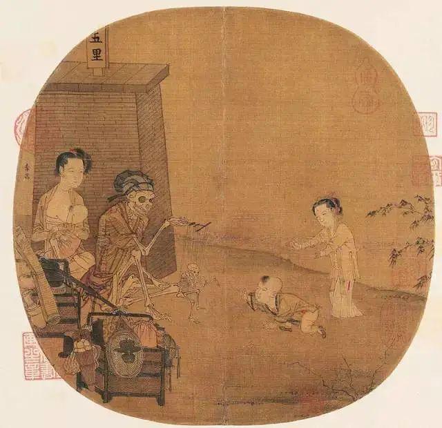 在這幅團(tuán)扇大小的畫面中,李嵩描繪了一幅傀儡戲的演出場景,一幅披衣戴帽的大骷髏,操縱著線板,指揮著一幅小骷髏在表演各種動作。一個嬰兒好奇地爬向那個表演中的骷髏小傀儡……活人與骷髏、生與死,同時(shí)出現(xiàn)于畫面中,在中國古畫里是極罕有的,也因此引起了后世的種種猜測解讀。