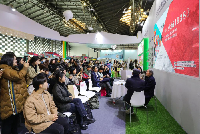11月17日,藝術家蔡皋(右一)在第十屆中國上海國際童書展現(xiàn)場與書迷交流。