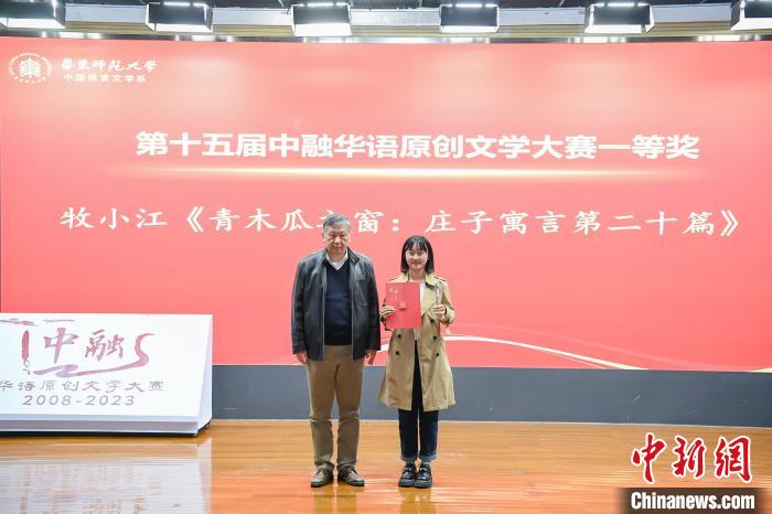第十五屆中融華語原創(chuàng)文學大賽一等獎獲得者朱禹同(筆名牧小江)從孫甘露手中接過獎狀、獎杯。(華東師范大學供圖)