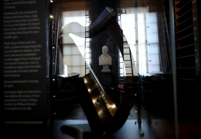 這是在愛(ài)爾蘭都柏林大學(xué)圣三一學(xué)院老圖書館拍攝的豎琴和雕像(1月16日攝)。
