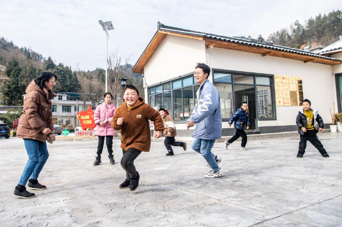 1月24日,在重慶市巫山縣騾坪鎮(zhèn)路口村數(shù)字農(nóng)家書屋外,“臨時家長”和孩子們一起玩游戲。