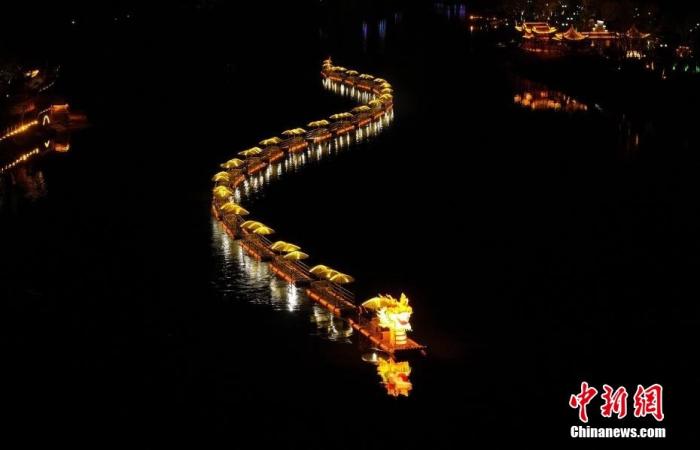 資料圖:一條200米長的水上金龍?jiān)诎不帐↑S山市休寧縣齊云山鎮(zhèn)橫江江面上游弋而過,龍燈迤邐,與江畔的古民居夜色相映成輝,喜迎新春。施亞磊 攝