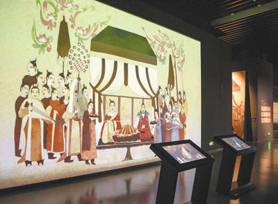 徐顯秀墓北壁壁畫《宴飲圖》互動(dòng)投影墻。人民網(wǎng)記者 王 帆攝