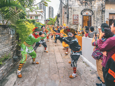 2023年11月12日,第八屆嶺南民俗文化節(jié)下基層演出在三溪舉行。圖為來(lái)自廣東普寧的英歌舞展演,引來(lái)群眾不斷喝彩。鄭建邦攝