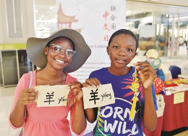 20日,孩子們在博茨瓦納哈博羅內(nèi)舉行的中文日慶?;顒由险故緷h字。 新華社發(fā)
