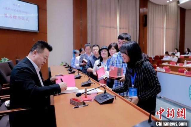 圖為邱華棟向部分參會(huì)代表進(jìn)行現(xiàn)場(chǎng)簽名贈(zèng)書(shū)?!?nèi)蒙古師范大學(xué)供圖