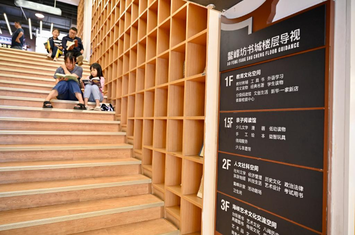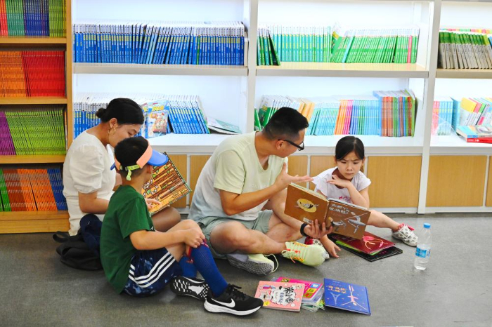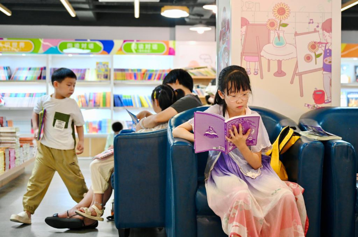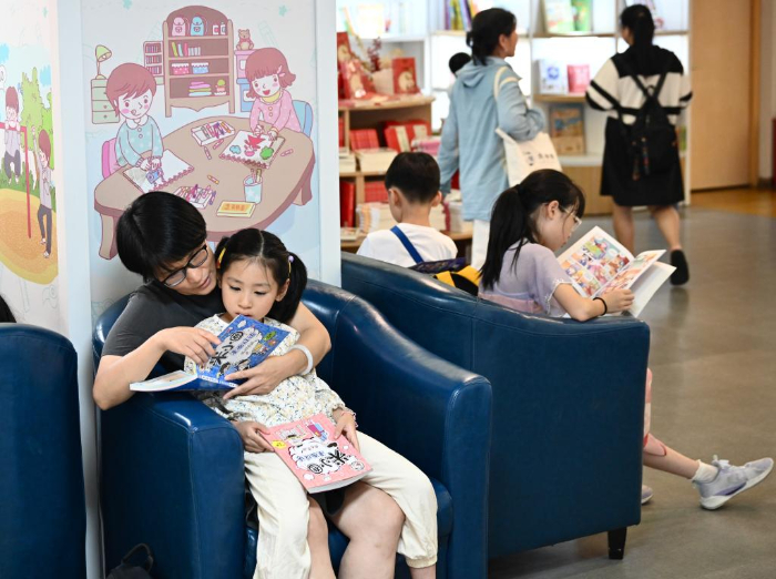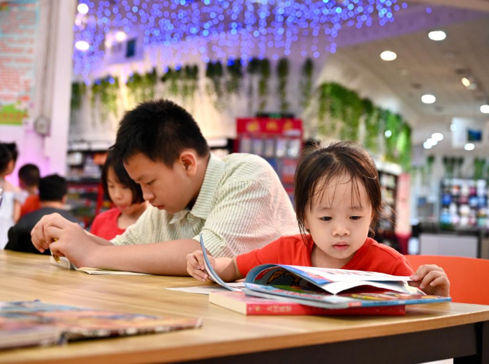 7月6日,福州新華書店鰲峰坊書城內家長陪伴孩子讀書納涼。