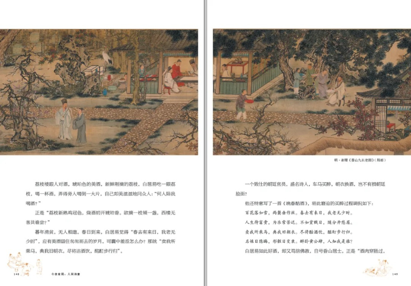 值得一提的事,這本書有很多稀見的插圖。比如讀到司馬相如的時候,配有明代仇英的《上林圖》;比如說曹植,所用的顧愷之《洛神賦圖》也是根據(jù)曹植傳世名篇《洛神賦》而來;寫白居易則是用謝環(huán)的《香山九長老圖》。