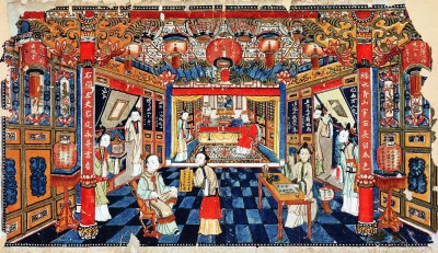 整幅年畫為我們呈現(xiàn)了一個處處燈光相映、人人語笑喧闐的祥和景象。畫中人物采用中國繪畫技法,線描敷色均呈現(xiàn)平面化特征,而居室空間則采用在清代稱為“線法畫”的技法,借鑒西方焦點(diǎn)透視法,使畫面產(chǎn)生立體感,將觀者的目光緩緩引入熱鬧溫馨的場景之中。