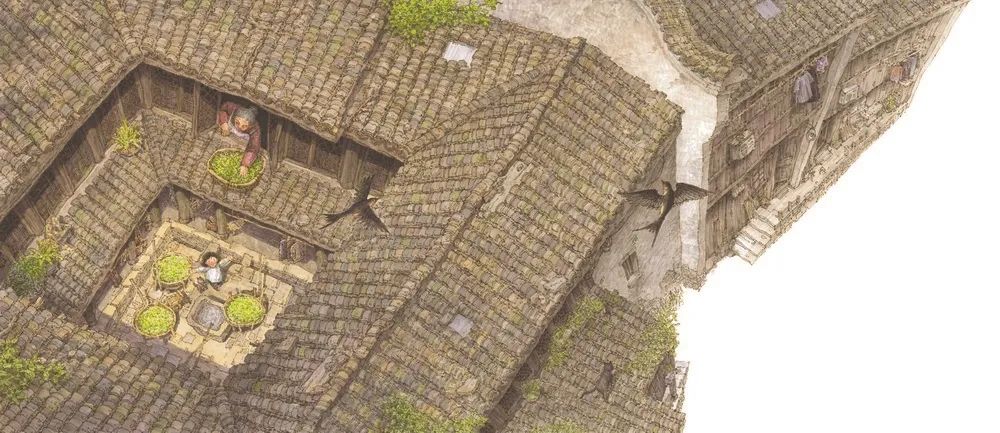 全書以時(shí)間和空間的變化為順序,以外公的搖船劃開故事的序幕,讓充滿煙火氣的江南生活伴隨著搖櫓聲和水聲悠悠緩緩地展現(xiàn)。江南盛產(chǎn)絲綢,養(yǎng)蠶是江南的常見活計(jì)。一大清早,外公外婆的勞作就開始了。外公劃船去鎮(zhèn)外采來桑葉,外婆在天井晾干桑葉上的露水,而丫丫喜歡在天井里玩耍,由此帶出了天井里“四水歸堂”的水槽設(shè)計(jì)知識(shí)。丫丫折紙船讓它順著回字形的水槽漂到外面的河里去,這一游戲帶來了有趣的細(xì)節(jié)。曬完桑葉,一家人在亭子間吃早飯,路過的漁船隨手拋來鮮魚,此舉揮灑的是淳樸的鄉(xiāng)間情意。早飯后,丫丫幫外婆把桑葉搬到閣樓上去喂蠶寶寶,養(yǎng)蠶的愉悅在蠶吃桑葉的聲音中奏響。日頭升高時(shí)店鋪開張,外婆賣蠶絲品,丫丫也順帶著賣她親手養(yǎng)的蠶繭。小鎮(zhèn)人靠養(yǎng)蠶來自給自足的生活,平淡而安逸。除了養(yǎng)蠶,江南人家還自制特色小菜。“外婆最珍惜陽光。南方雨水太多,遇到一個(gè)難得的大晴天,外婆就跟從老天爺那里白得了寶貝似的,喜滋滋地把閣樓的天窗打開,在黑瓦的屋頂上擺上一個(gè)個(gè)大竹匾,曬她一刀一刀切出來的蘿卜干、茄子干和筍干。”這些一刀一刀切出來、一日一日曬出來的家鄉(xiāng)的味道會(huì)留存舌尖,讓外出的游子留戀。順著屋頂眺望,連片的房舍和高大的馬頭墻赫然可見。有意思的是,橋上的廊檐讓孩子們雨天也有玩處;而晚間在臨水戲臺(tái)上的昆曲演出則使小鎮(zhèn)人們歡聚一堂,臺(tái)下臺(tái)上組成熟悉又夢(mèng)幻的世界,讓丫丫陶醉其中……