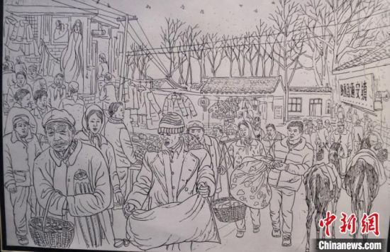 蘭州鋼筆畫(huà)愛(ài)好者周新平勾勒了數(shù)組關(guān)于鄉(xiāng)村記憶的鋼筆畫(huà),其中,《隴西臘月圖》是他歷時(shí)三個(gè)多月,手繪了200多村民,完成的一幅舊時(shí)農(nóng)民過(guò)年趕集的熱鬧圖景:賣糖葫蘆的小販、剪紙賀春的手藝人、趕車挑擔(dān)的趕集人……周新平說(shuō),他很怕“集市文化”將來(lái)被人們遺忘,用鋼筆記錄下來(lái),留住記憶里的“年味”以感悟鄉(xiāng)愁。